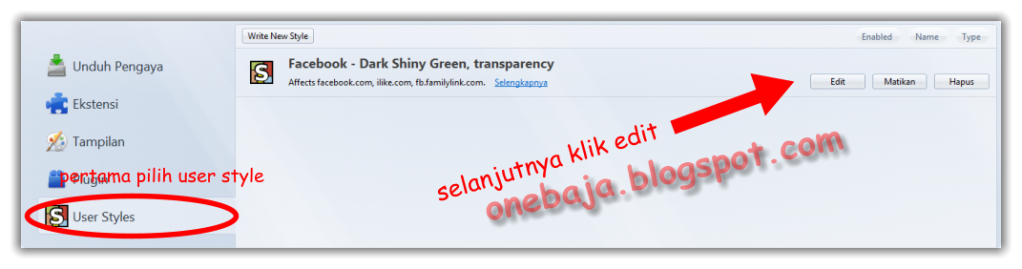 pilih tab User Styles, dan klik tombol edit, maka akan keluar halaman script html, nah disanalah letak kode url yang harus sobat ganti, lebih jelasnya lihat gambar dibawah ini :